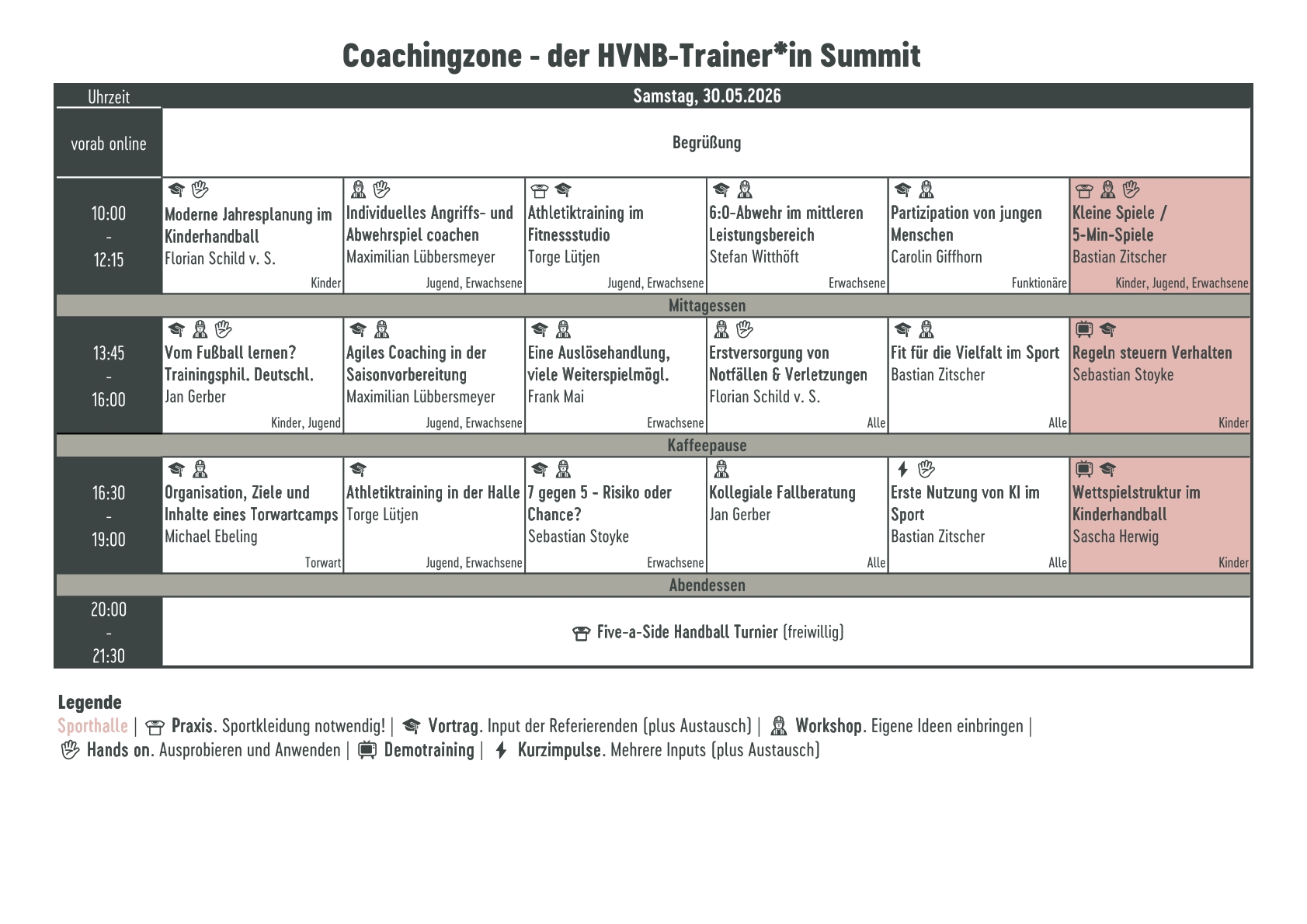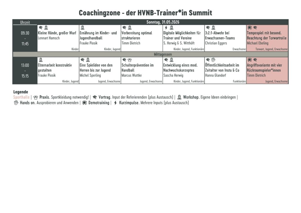 Vom 30. bis 31. Mai 2026, Samstag bis Sonntag, veranstaltet der Handballverband Niedersachsen-Bremen (HVNB) in Barsinghausen die zweite Auflage des HVNB-Trainer*in Summit „Coachingzone“.